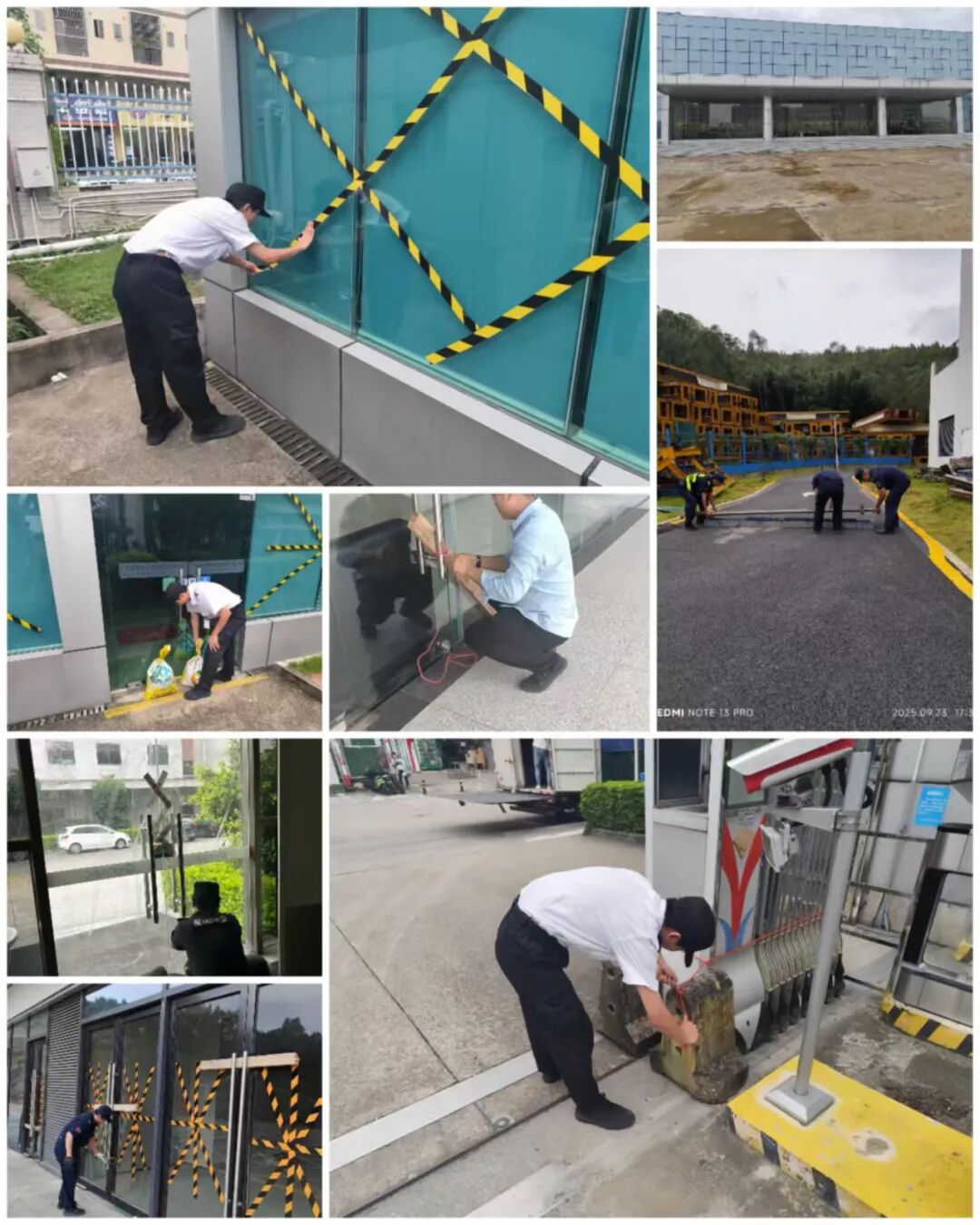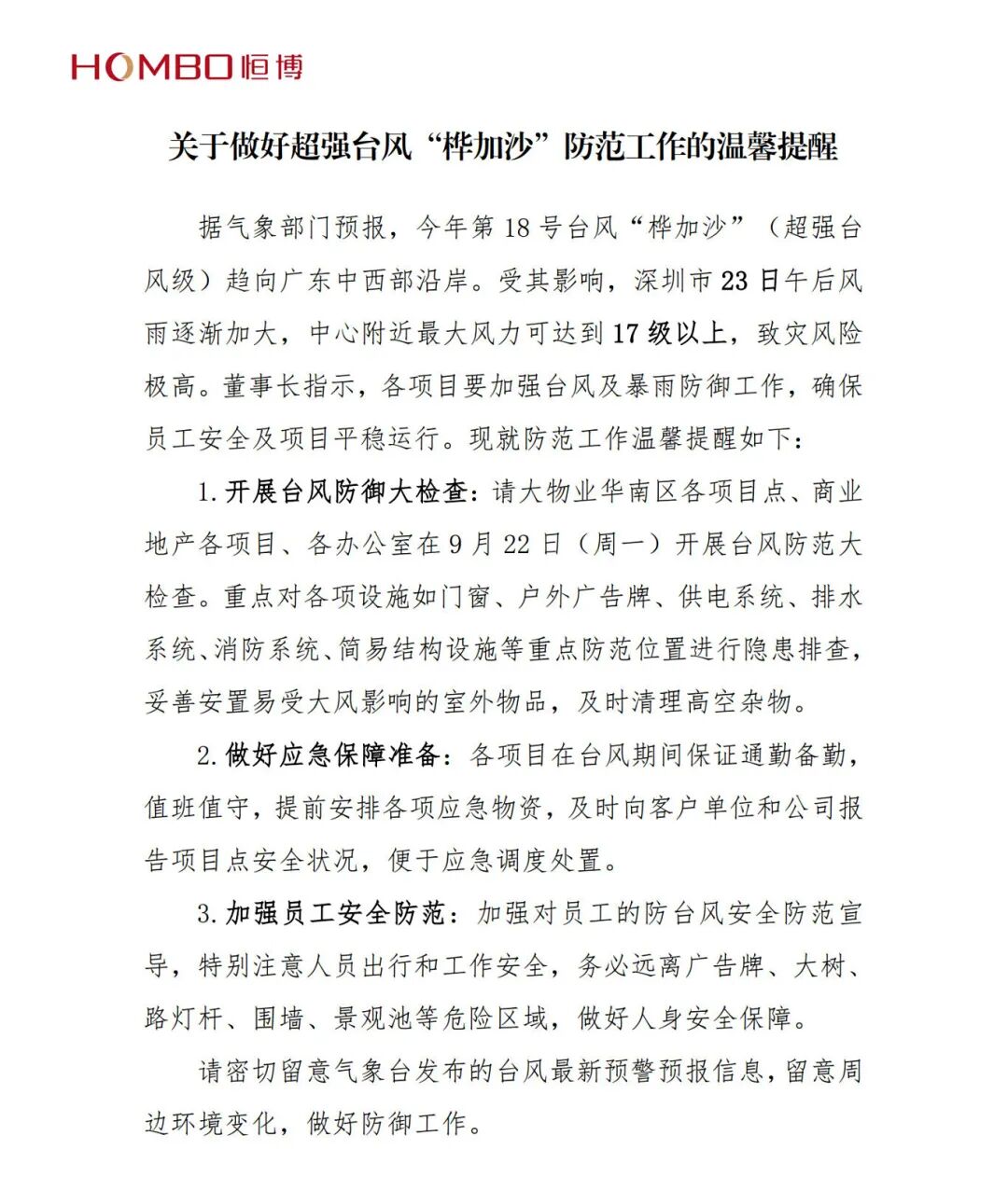 2025年第十八号台风“桦加沙”来势汹汹,深圳于9月23日启动防台风防汛一级应急响应。恒博国际全员进入临战状态,集团旗下的保安物业、商业地产、商超运营等板块迅速响应,全面开启防风防汛工作,保障客户单位及员工生命财产安全,用实际行动守护安全防线。 面对即将到来的超强台风威胁,集团高度重视。9月22日,吴贵州董事长召开专题会议部署防台风工作,要求各单位迅速启动防台风应急响应,各项目负责人坚守在项目岗位上,机电及行政人员排班应急抢险救援。随后,各板块、各项目全面进入临战状态。 恒博保安公司组织各项目严格落实隐患排查、物资准备与应急值守工作,协助客户做好安全检查。各项目负责人作为防台防汛第一责任人,严格落实24小时值班值守制度。配合客户对服务区域进行全面排查,包括排水系统、供电设施、户外广告、门窗等安全隐患,确保风险隐患“早发现、早处置”。 恒博商业地产各项目扎实推进各项抗台防汛准备。台风来临前,工作人员持续对各类消防设施、电梯、水电系统、地下车库等关键区域开展隐患排查,发现问题立整立改,确保无遗漏、无死角。同时,客户服务中心逐户向客户发送防风温馨提示,并协助客户妥善安置物品。 恒博商超运营旗下各门店及供应链仓库迅速完成玻璃加固、布置外围围挡、电路安全检查、物资保障等防台抗汛举措。各门店及仓库优先做好物资防护,垫高底层商品,清理仓库排水并装挡水板。 风雨之中见担当,逆风前行显本色。恒博人以高度的职业素养与专业态度,用最充分的准备、最扎实的行动,用心守护好每一个项目、每一位客户、每一位员工的安全。用实际行动诠释恒博人的责任与担当。